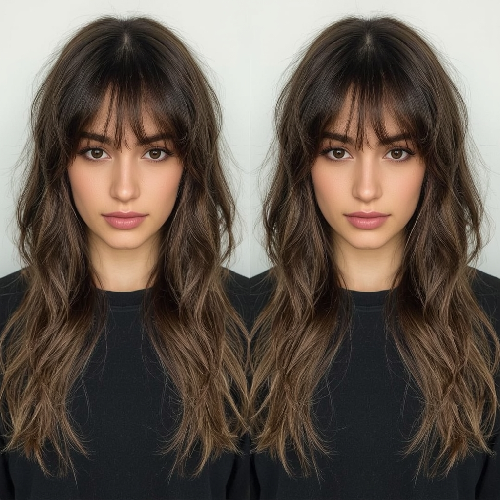 Rich brown tones combined with voluminous layers create a glamorous and luxurious hairstyle. Full bangs enhance the facial frame, while the layered body adds movement and depth. Gloss sprays or light serums enhance shine and smoothness, keeping hair looking vibrant and healthy. This look is perfect for thick hair and can easily be adapted for both everyday wear and special occasions.