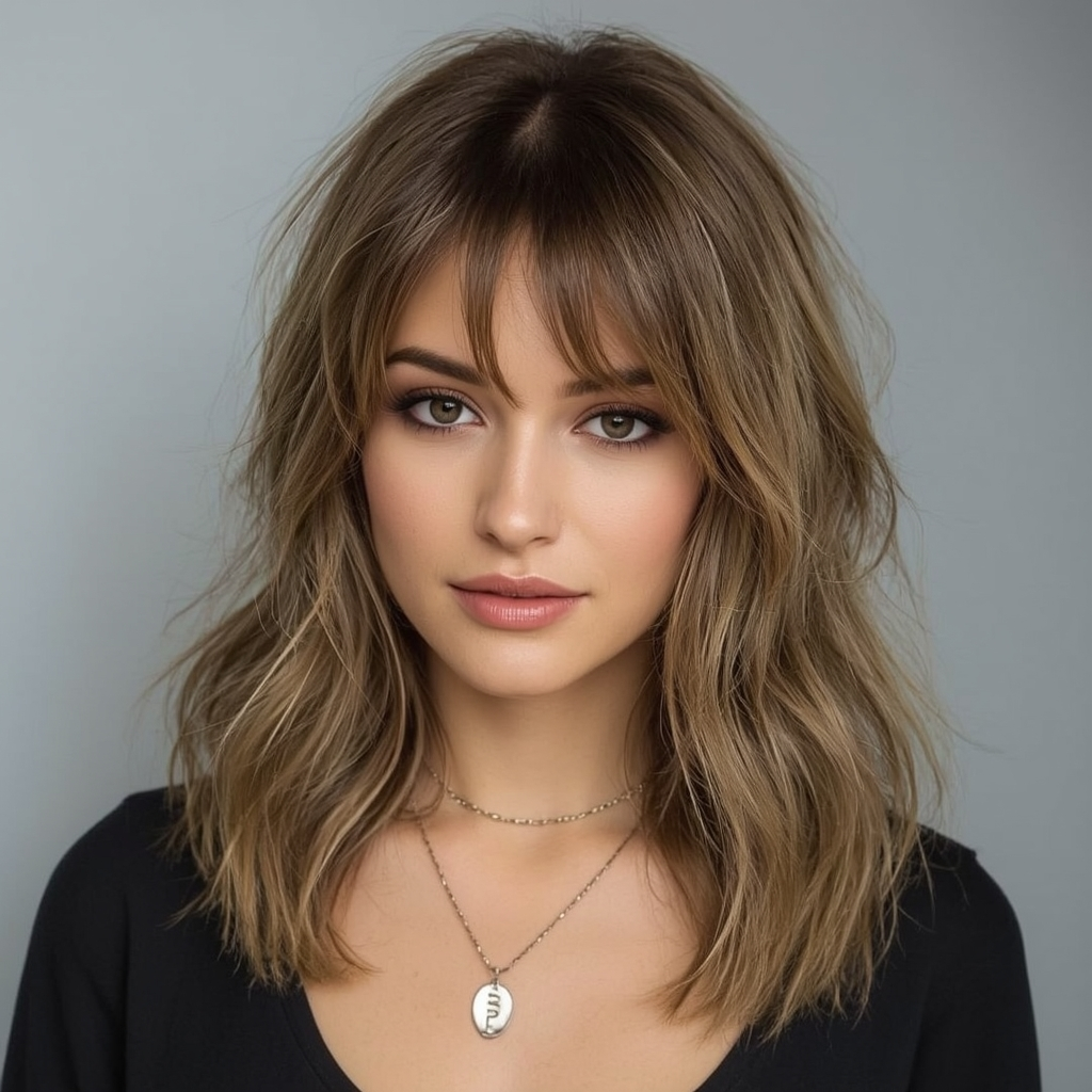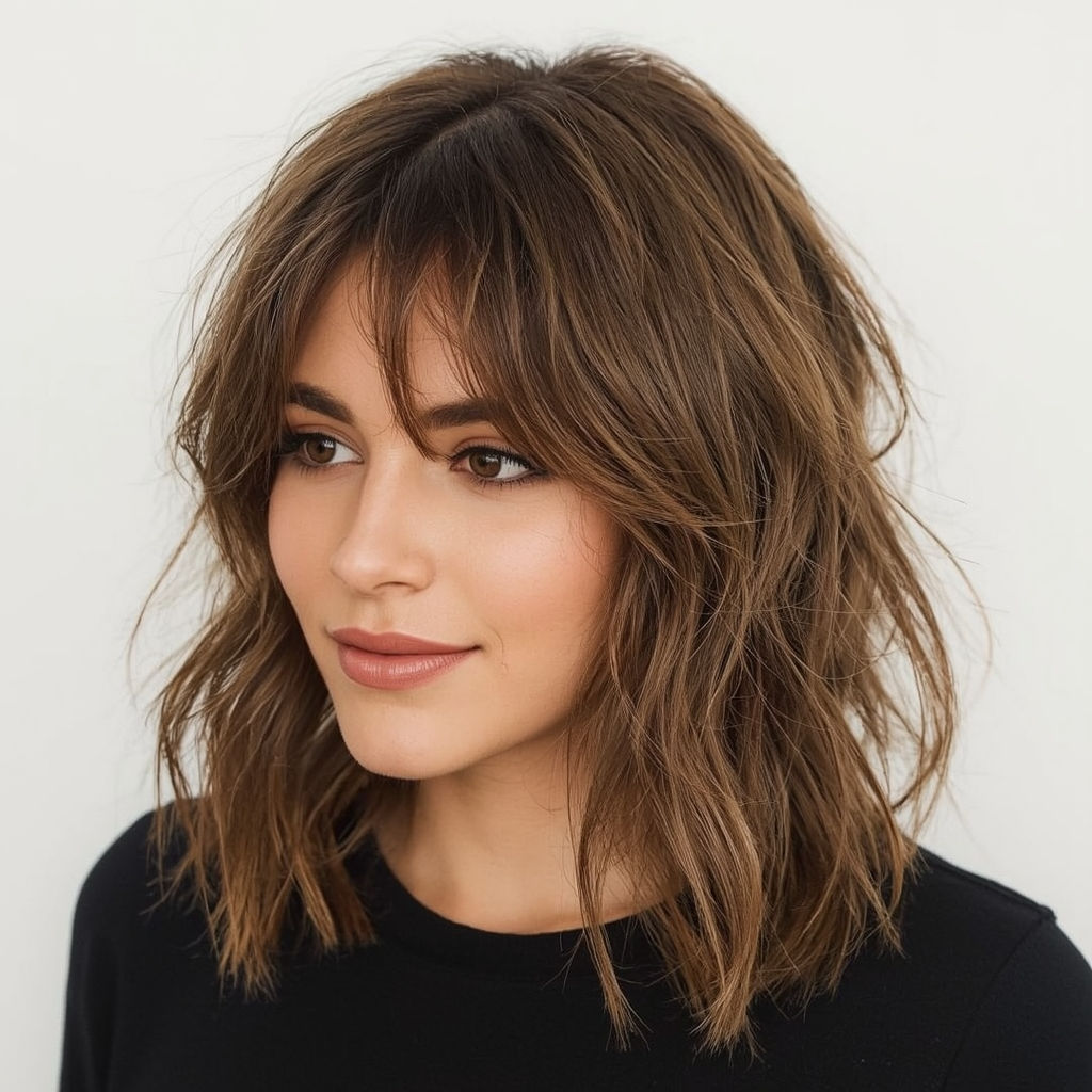 This versatile, layered haircut with bangs is low-maintenance yet stylish. The layers create gentle movement while the bangs add a youthful frame to the face. A lightweight conditioner ensures smoothness and shine, making styling effortless. This hairstyle is timeless, ideal for women who want a practical yet elegant everyday look.