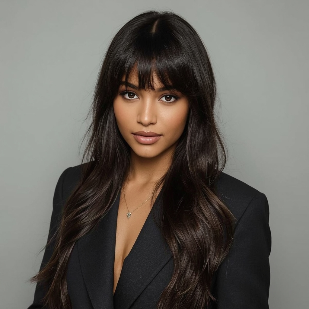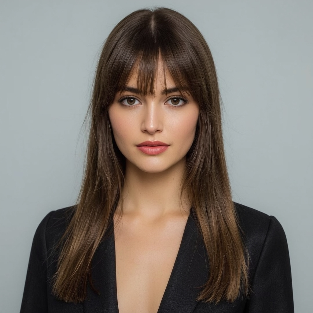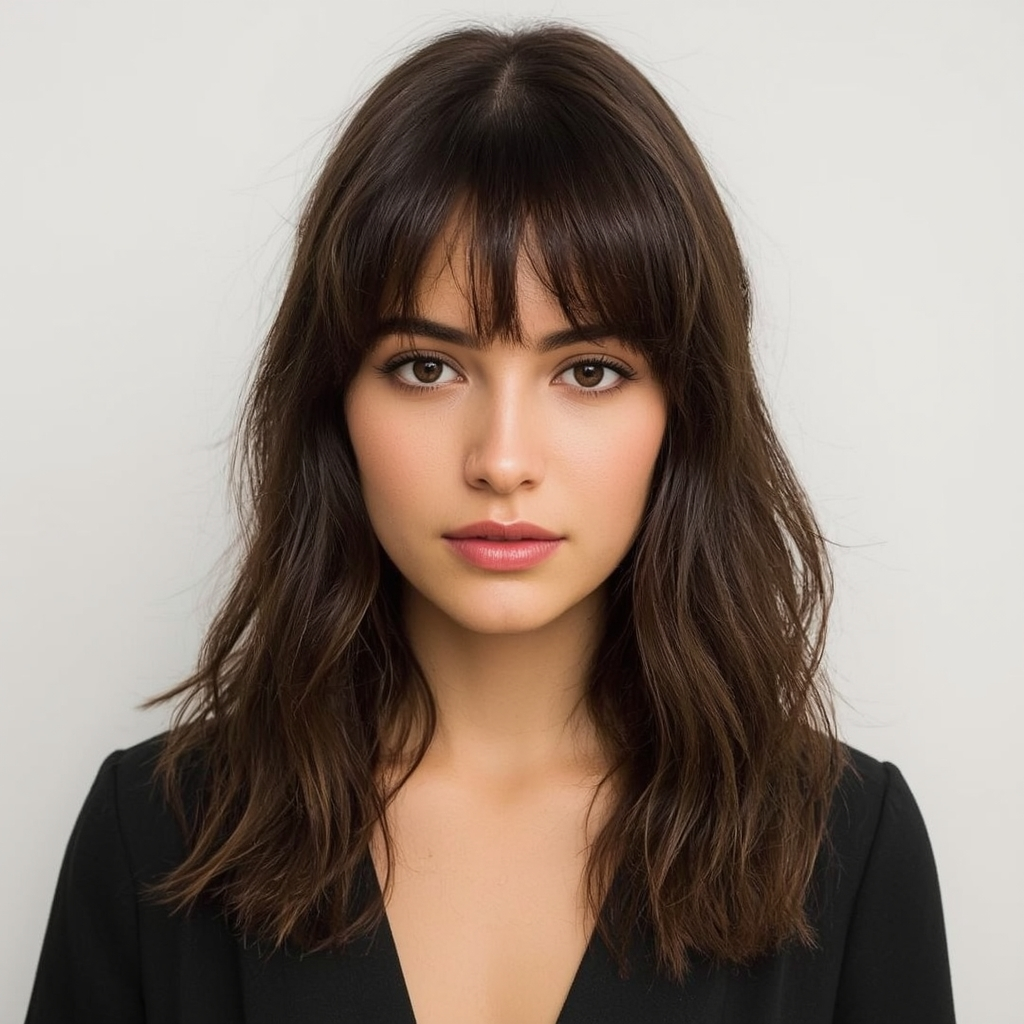 Deep brunette tones combined with full, blunt bangs create a rich, elegant style. The bangs frame the face, enhancing features while maintaining balance. Regular trims every four to six weeks keep the bangs fresh and prevent split ends. Sulfate-free shampoos and conditioners preserve hair color and shine, while occasional gloss sprays add extra radiance.
