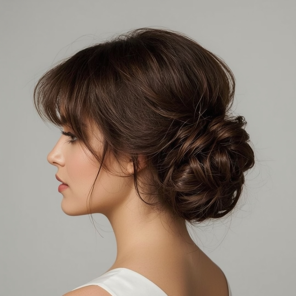 Pairing an updo with full bangs adds a touch of elegance and refinement. Ideal for weddings, parties, or professional events, this style keeps hair neatly contained while allowing bangs to soften the face. Use strong-hold hairspray and bobby pins to secure the updo. For a more romantic look, gently curl the bangs or leave a few wispy strands around the face.