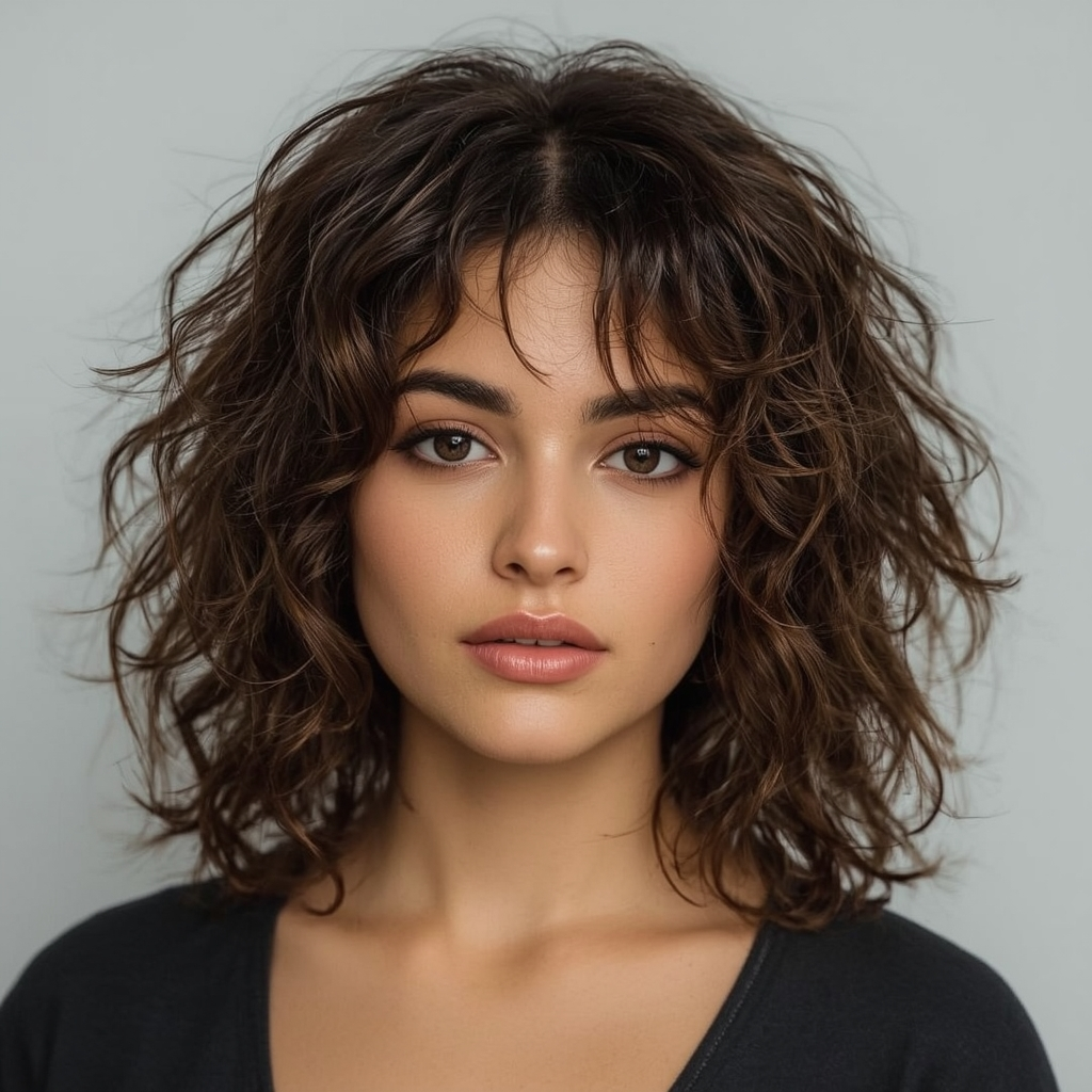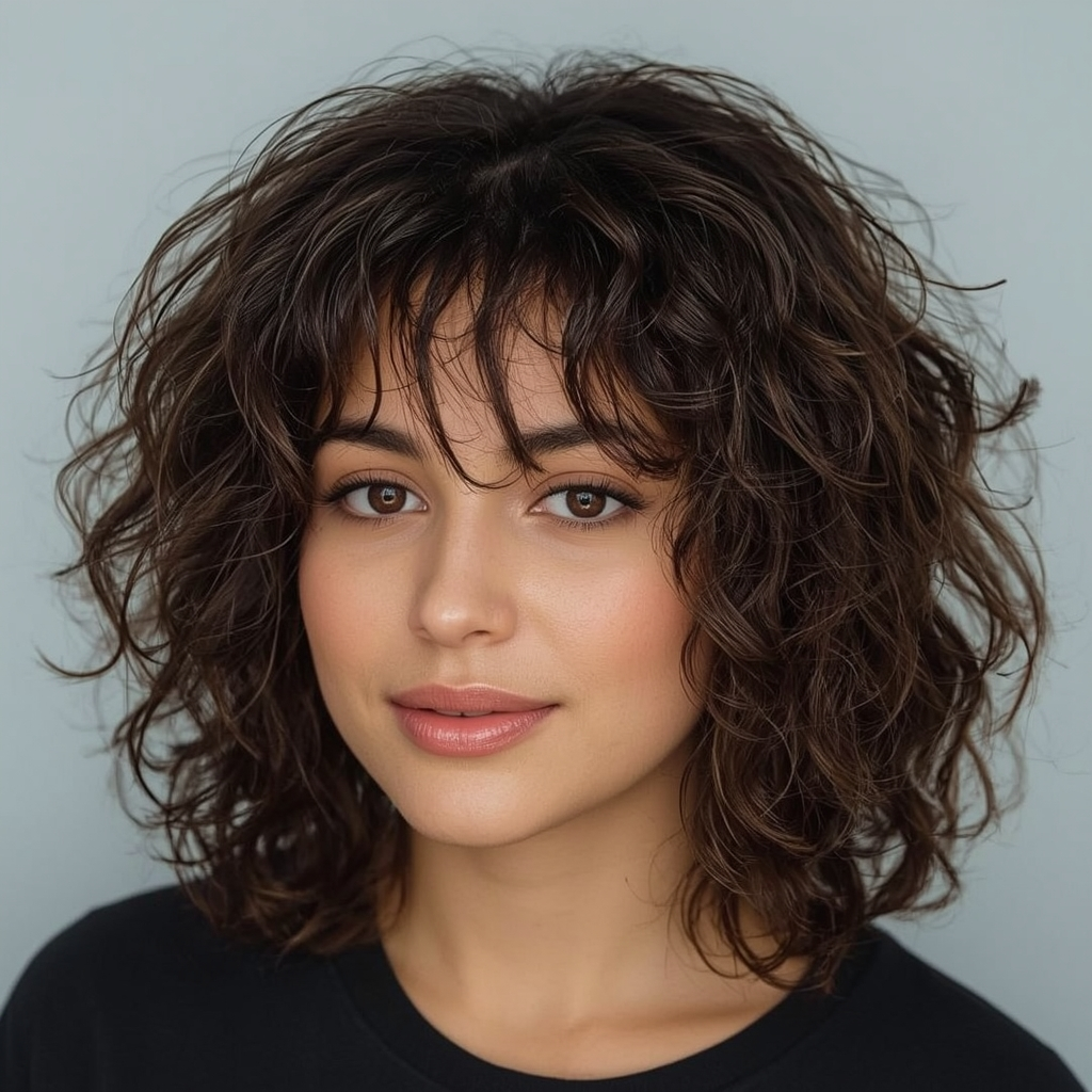 For naturally curly hair, pairing full curls with choppy bangs adds dimension and face-framing flair. The textured bangs prevent curls from appearing heavy and create a balanced, dynamic shape. Use moisturizing curl creams or conditioners to maintain hydration and prevent frizz. Regular trims help maintain shape and structure, keeping curls fresh, lively, and easy to manage.