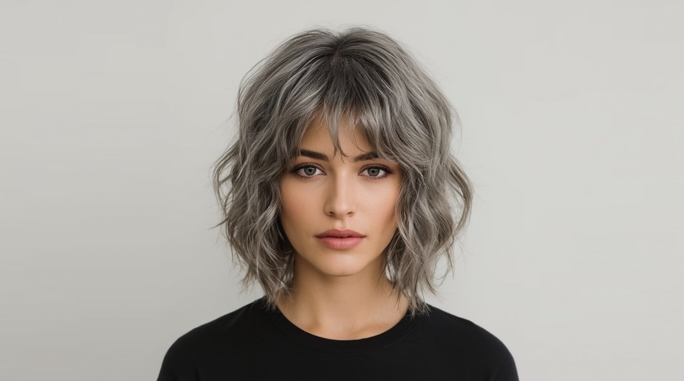This elegant gray hairstyle uses full bangs to create a modern and fresh appeal. Wavy textures add volume and movement, making the hair look youthful and dynamic. The cut’s versatility allows it to be styled in multiple ways, from casual to formal settings. Light mousse or curl cream can enhance waves, while occasional blow-drying ensures the bangs stay smooth and structured.