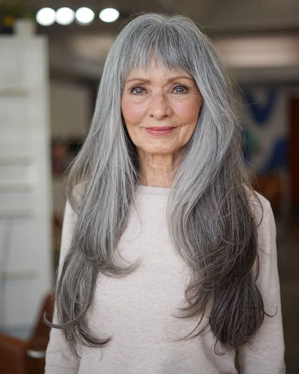 A mixed-tone shag highlights gray and black shades beautifully, creating a graceful and sophisticated appearance. The layers add dimension and movement while keeping maintenance low. This cut proves that age does not limit style, offering a chic and elegant look for older women.