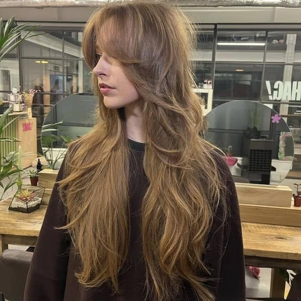 For those who love long hair but want structure, a very long wolf cut with bangs and layers is a dream. Layers break up the length, preventing hair from appearing flat or heavy while adding natural flow and bounce. Curtain or soft bangs highlight the face, drawing attention to eyes and cheekbones. This haircut is especially flattering on oval and heart-shaped faces. It is versatile for both casual and polished occasions and works well with natural waves or smooth textures, offering a balance of elegance and ease.