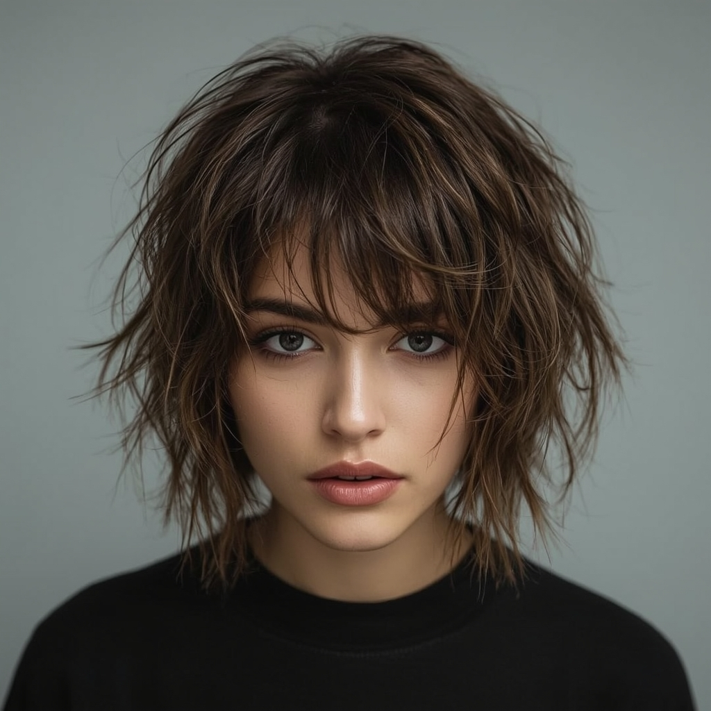 A messy wolf cut with blunt bangs combines structured and tousled elements for a grungy-cool aesthetic. The sharp fringe contrasts with the textured body, giving the hair an edgy, runway-ready appearance. Styling is versatile: air-dry for a natural messy look or lightly smooth bangs while leaving layers tousled. This haircut pairs beautifully with statement makeup or casual street style, creating a modern, playful, and confident vibe.