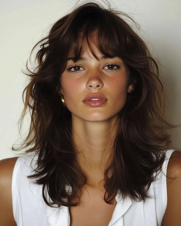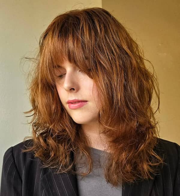 The layered shaggy haircut with long bangs emphasizes volume and carefree texture. Collarbones-length layers create natural movement, while long bangs frame the face softly.