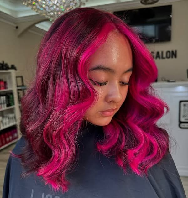 The pink center-parted wavy haircut combines bold color with soft movement. Loose waves complement the vibrant pink hue, creating a feminine yet edgy style.