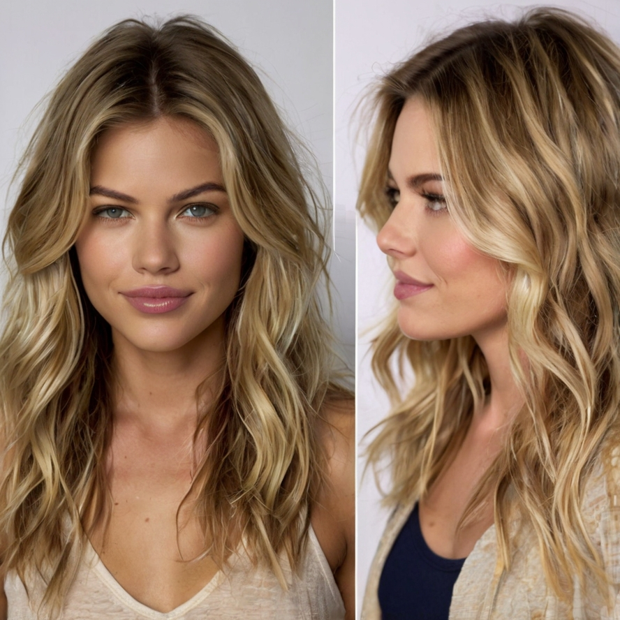 A blonde beachy wavy haircut radiates effortless, sun-kissed charm. Loose waves paired with soft blonde tones create a breezy, relaxed look suitable for any season.