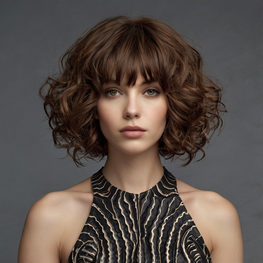 The bouncy layered wavy haircut with blunt bangs delivers volume, movement, and playful texture. Layers throughout the hair keep waves lifted, while blunt bangs create a sharp, stylish frame for the face.