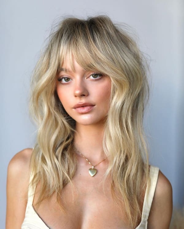 Blonde waves can be effortlessly chic when paired with layers and bangs. This medium-length cut not only frames the face beautifully but also adds volume and bounce. The layered design allows the hair to move freely, giving a youthful, radiant look. This style is ideal for anyone wanting a soft, feminine haircut that remains versatile for everyday wear or special occasions.