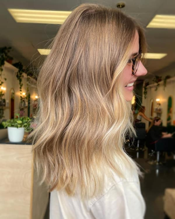 Layered wavy blonde hair adds fullness and natural texture to thin hair. Layers keep the ends light, and the center part enhances symmetry. This medium-length style is flattering for almost any face shape and perfect for casual, everyday elegance.