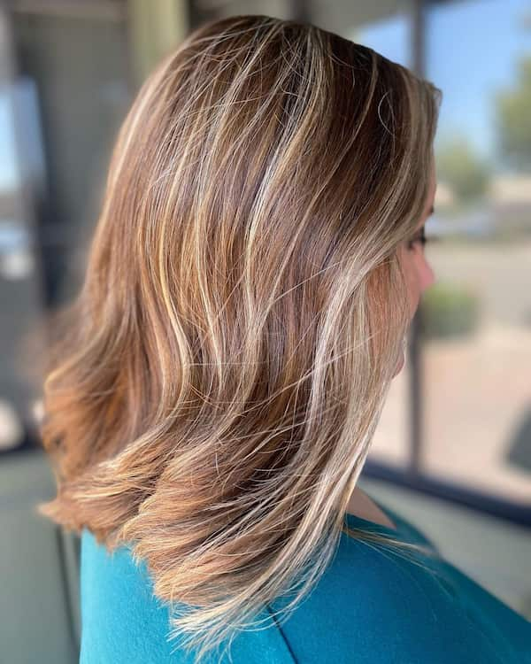 Medium-length brunette hair with blonde highlights provides texture and dimension for thin hair. The highlights catch the light, making the layers appear fuller. A center parting or soft side sweep adds structure, ensuring your medium-length hair looks healthy, lively, and effortlessly chic for work, dates, or casual days out.
