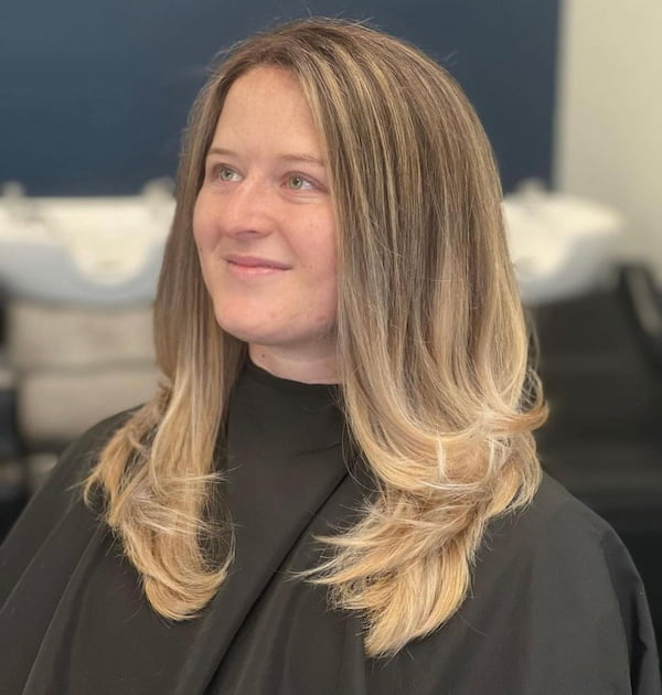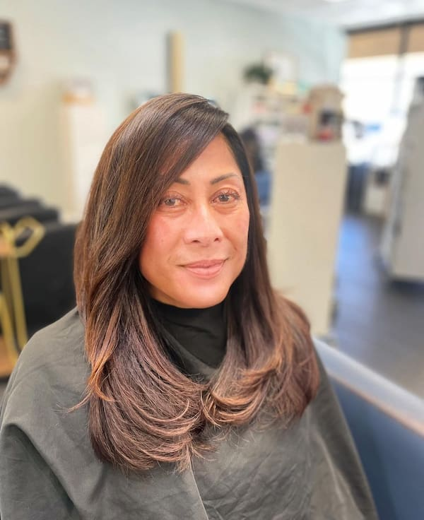 A side parting combined with soft butterfly layers delivers a sophisticated yet approachable style. The layers enhance volume and frame the face beautifully, making it ideal for women in their fifties with natural fullness.