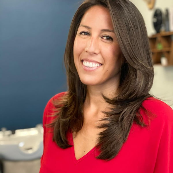 Adding multiple hair tones to a butterfly cut creates playful depth. The combination of natural brown with subtle highlights and bangs makes this mid-length haircut unique and flattering. Perfect for women looking to make a creative, elegant statement.