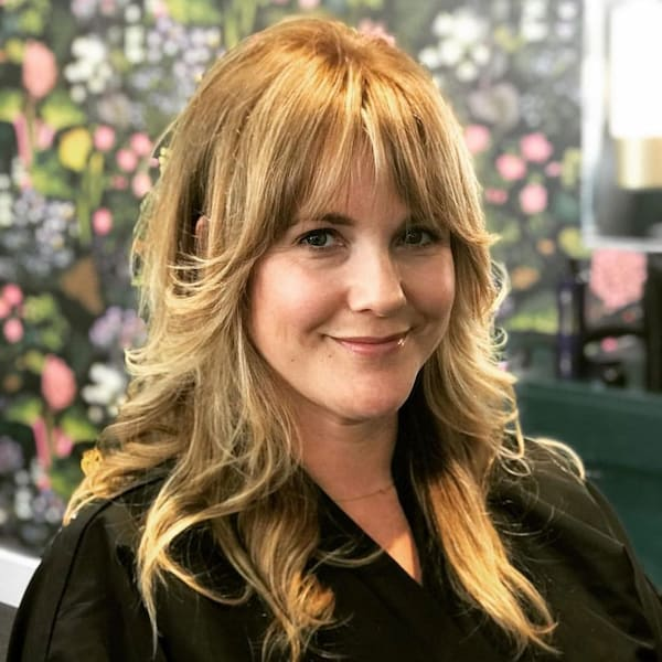 Bold bangs paired with textured layers elevate medium-length hair. The bright blonde color highlights the layers, giving hair a fuller, dimensional appearance. This style is playful yet sophisticated, perfect for women who want attention to detail.