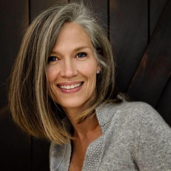 This mix of blonde with natural gray creates a soft, dimensional effect. Medium-length layers add movement, and a center parting frames the face perfectly. Ideal for women over 50 who want a playful yet refined look.