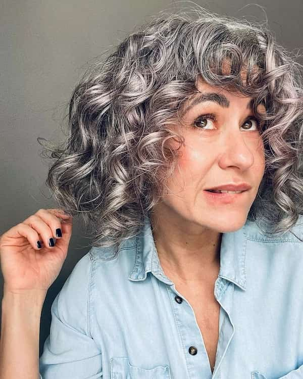 Gray curls paired with bangs create a charming, dimensional look. The medium-length structure balances volume and manageability, while the bangs add a youthful touch. Perfect for women who want to embrace their natural gray hair.