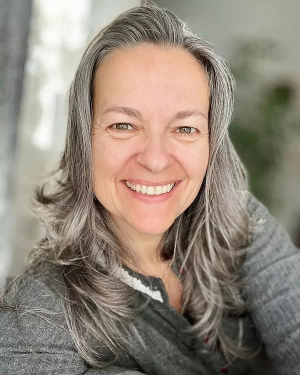 Embracing natural gray is both stylish and empowering. This center-parted cut keeps the hair sleek and symmetrical while maintaining softness around the face. Its mid-length structure works well for a polished daily look, showing that gray hair can be chic and versatile.