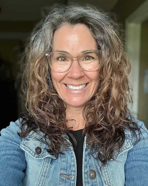 Brown mixed with gray highlights creates depth and dimension in curly hair. Side parting adds elegance while curls provide natural volume. A versatile style suitable for casual or formal occasions.