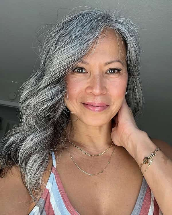 Medium-length gray waves bring softness and movement to thin or aging hair. The cut enhances natural texture and adds body, while maintaining a chic and effortless appearance for women over 50.