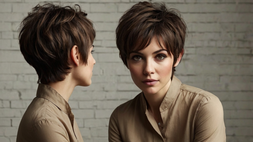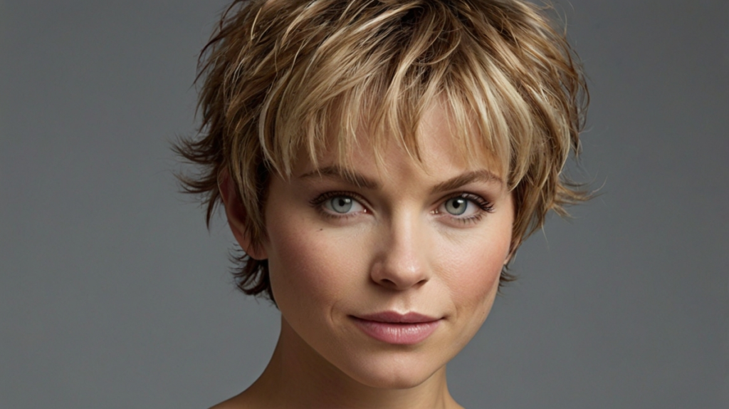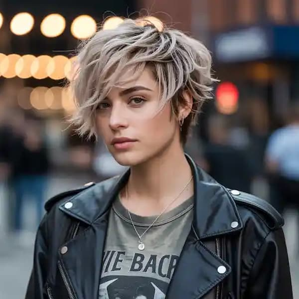 Layers and texture define this edgy pixie, giving hair natural movement while preventing flatness. It’s easy to maintain and offers effortless cool, making it ideal for women seeking a distinctive yet practical short haircut.
