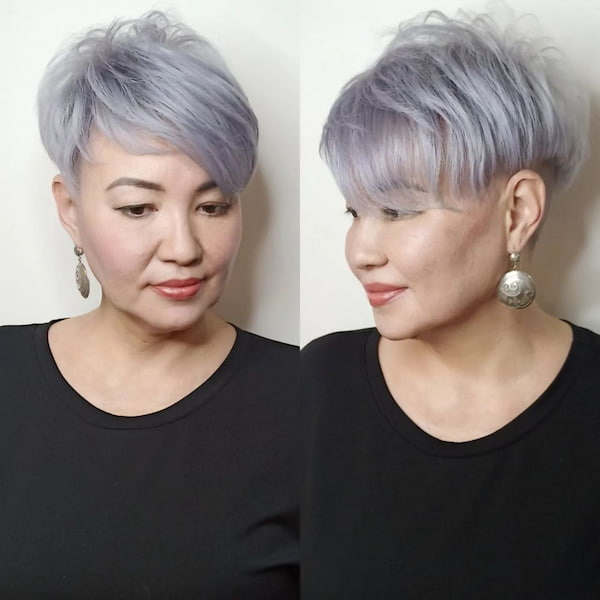 A side-fringe pixie bob adds dimension and conceals fine areas effortlessly. The side sweep provides balance and softens the face, while the overall cut maintains structure and elegance. This haircut is ideal for women embracing gray hair, as the fringe distracts from thinness and creates a sophisticated, age-appropriate style that still feels playful and modern.