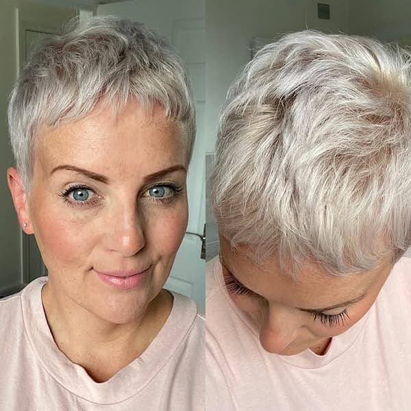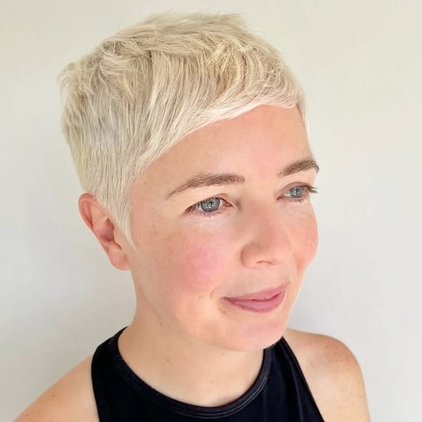 Styling this cut is simple and requires minimal effort. A volumizing mousse or light cream can enhance the layered effect, while brushing the side bangs across the forehead softens facial features. This pixie also suits a variety of face shapes, with the side bangs especially flattering for those with high foreheads or square jawlines.