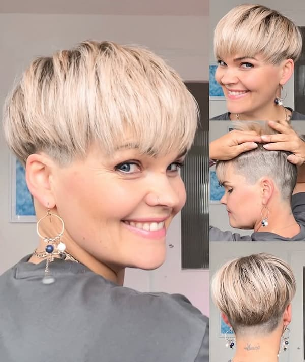 Regular trims are essential to maintain the clean lines of the shaved sections. This style works for mature women who want to experiment with a contemporary look without spending hours on styling. Overall, the short pixie with shaved sides is an excellent choice for women seeking confidence, individuality, and ease in a single haircut