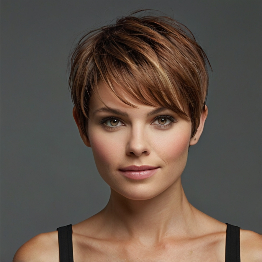 The layered pixie with side bangs is a sophisticated and flattering option that softens facial features while adding texture and volume. Side bangs subtly frame the forehead, complementing the layers to create a harmonious look. This cut is ideal for women seeking elegance without appearing over-styled or rigid.