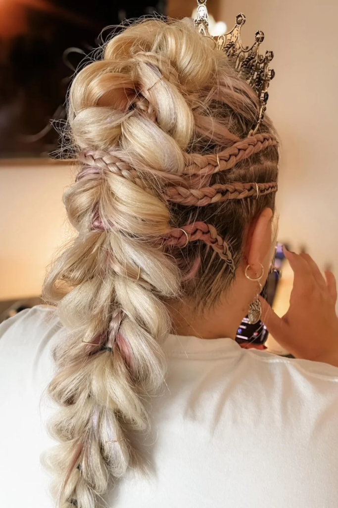 Begin with two Dutch braids starting at the front hairline and working toward the crown. Merge them into a single ponytail for a sporty yet chic look. This hairstyle keeps hair neatly in place for long events, adding structure while remaining stylish and visually engaging. Its braid-to-ponytail transition ensures that your hairstyle is both functional and fashionable, suitable for dance, prom, or outdoor celebrations.