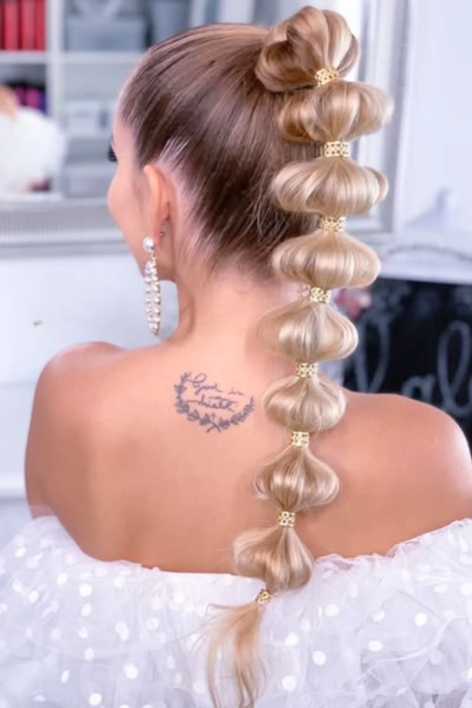 For a fun and trendy hairstyle, try the bubble ponytail. Gather your hair into a high or mid-level ponytail and secure it with an elastic. Add additional elastics at intervals of two to three inches down the length of the ponytail, creating a segmented “bubble” effect. This style adds volume, movement, and a youthful flair, making it perfect for parties or casual outings. It works equally well on straight or textured hair, and you can accessorize with ribbons or beads for extra charm.