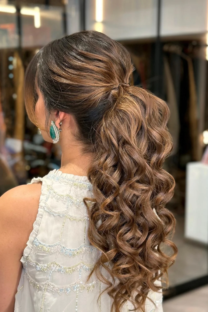 Combine the best of both worlds with a half-up ponytail. Take the top third of your hair and pull it into a ponytail at the crown, leaving the rest to flow freely. This style adds volume while highlighting your hair’s natural texture and length. It’s a glamorous yet understated option for formal events, offering movement and dimension without overpowering your overall look.