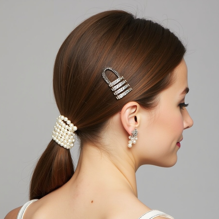 Create a refined, polished look by adding pearls to a low ponytail. Smooth your hair back neatly into a low ponytail at the nape and secure it with an elastic. Decorate with a pearl string wrapped around the base or place pearl-studded clips along the ponytail’s length. The result is a subtle yet luxurious style that elevates a simple ponytail into an elegant accessory, perfect for formal events or romantic evenings.