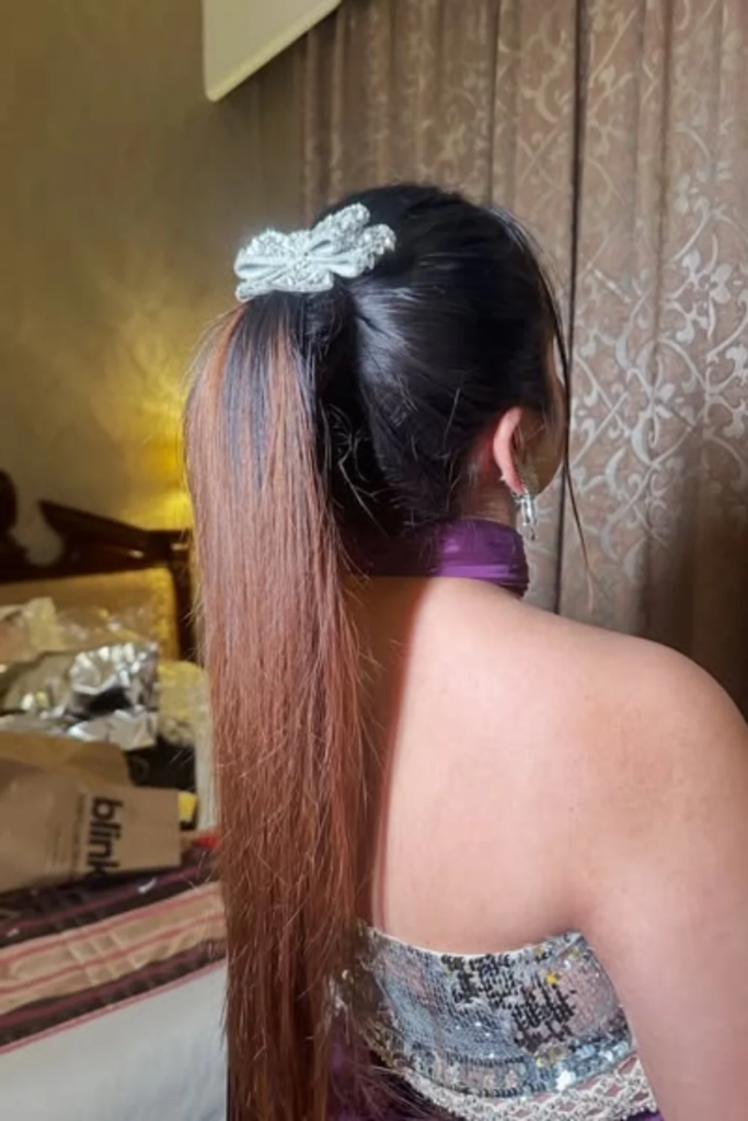 Incorporate a charming touch into your hairstyle by adding a bow. Secure your ponytail high or low, then tie a satin or velvet bow around the base. Matching or contrasting the bow with your outfit enhances visual appeal, giving the hairstyle a sweet, elegant twist. This simple addition transforms a classic ponytail into a playful, attention-grabbing statement perfect for prom or daytime events.
