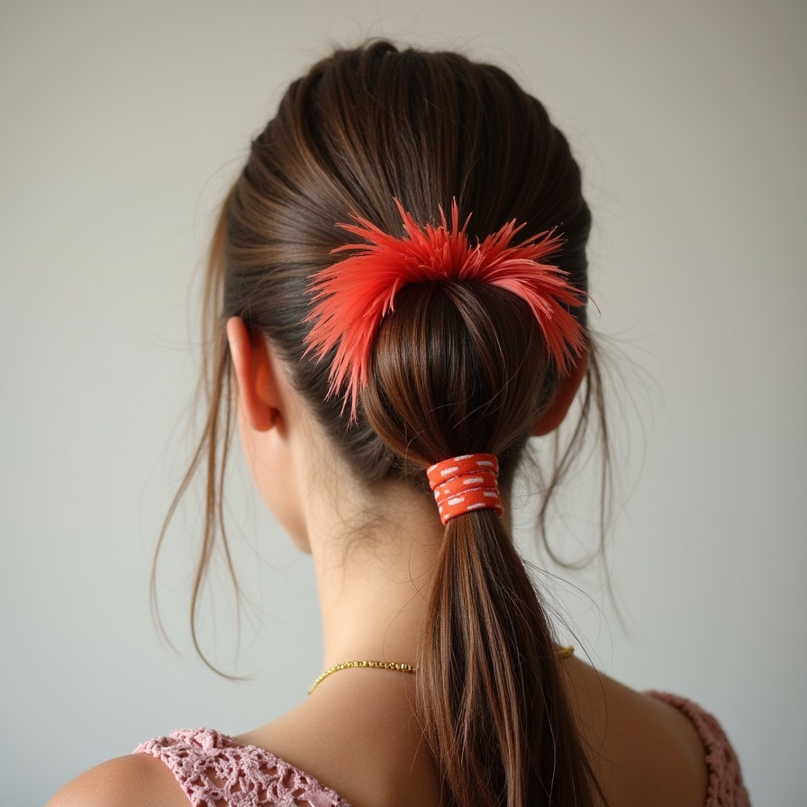 Add drama and whimsy to your ponytail with feathered accessories. Attach feather clips or bands around the base of your ponytail for a soft, ethereal effect. This style works well for creative events, fashion photoshoots, or themed celebrations, turning a simple ponytail into a standout, imaginative look.