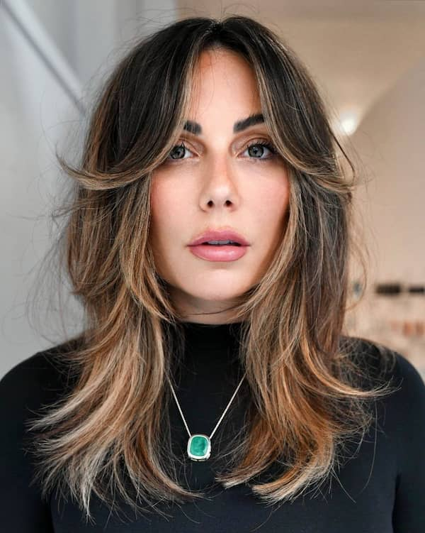 Layered shags with curtain bangs are timeless and versatile. Curtain bangs offer a soft framing effect while layers add movement and texture. Brown tones are particularly flattering, enhancing depth and shine. The combination of waves and layered curtain bangs creates a natural, effortless appearance that suits a variety of occasions. This style is adaptable for both everyday wear and more formal events, striking a balance between sophistication and casual charm.
