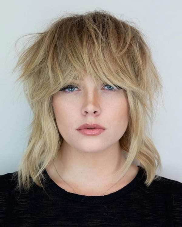 A messy layered shag emphasizes natural texture while maintaining a stylish appearance. Wispy bangs soften the face, complementing the layers without overpowering the look. This hairstyle works best for medium-length hair and is ideal for individuals who enjoy low-maintenance styles with an edgy, carefree feel.
