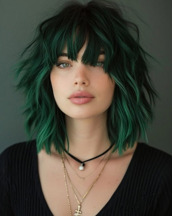 For those who love to make a bold statement, the edgy green-colored shaggy lob is a standout option. This vibrant cut combines unconventional color with a textured lob shape to create a daring, fashion-forward look. Pair it with a deep side part or tousled waves for extra volume and flair. It’s perfect for women wanting a rebellious yet stylish hairstyle that expresses individuality.