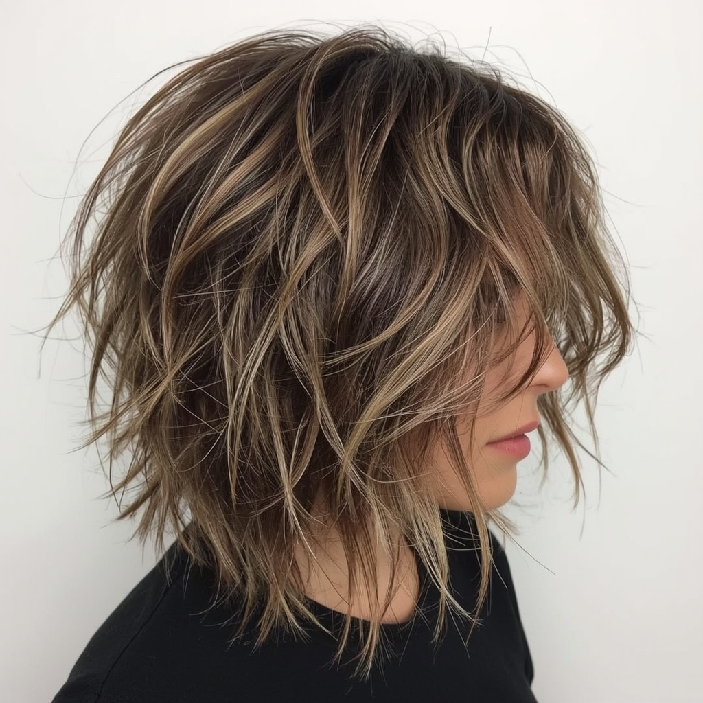 This multi-dimensional shaggy lob blends choppy layers with contrasting tones for a unique, fashion-forward look. Highlights and lowlights enhance depth, creating a striking visual effect. The choppy layers add texture and movement, making it ideal for women looking for a distinctive haircut that combines color and structure in a modern, edgy way.