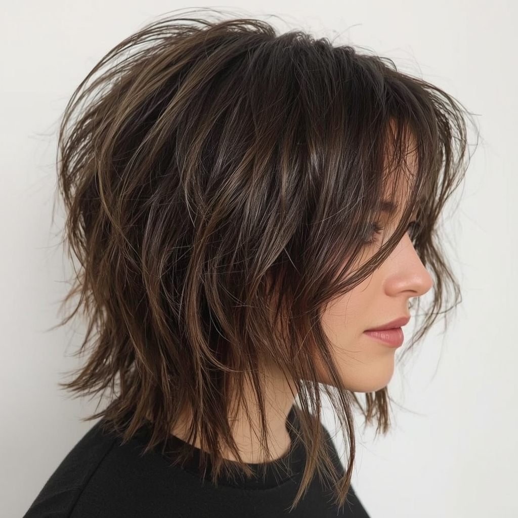 Adding choppy bangs to a shaggy lob introduces an edgy twist. This fusion incorporates elements of the wolf cut, providing attitude while keeping the lob polished and wearable. Choppy bangs frame the face with a playful, youthful vibe, while layered ends maintain volume and texture. The result is a versatile haircut that works well for both casual and fashion-forward occasions.