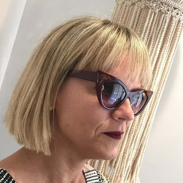 The A-line bob with bangs offers a contemporary twist on a classic shape. Longer in the front and shorter in the back, this cut adds sophistication while creating a slimming effect on the face. Paired with soft bangs, it frames the forehead beautifully and adds a touch of elegance. Ideal for women with fine or medium hair, this style allows for easy maintenance while providing a polished, structured look. The A-line bob is both modern and flattering, making it a perfect choice for women over 50.