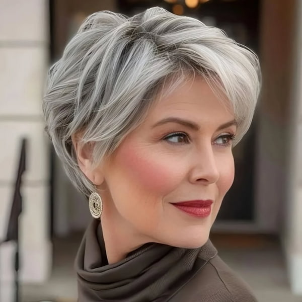 The gray-layered pixie bob offers a sophisticated yet playful update for women embracing their natural silver tones. Its layered design adds dimension and texture while maintaining a flattering silhouette. This haircut is particularly well-suited for women over 50, as it balances elegance with a modern edge. The short length keeps it manageable, and light styling products, such as a volumizing mousse or smoothing serum, can help accentuate the layered texture for a polished yet effortless look.