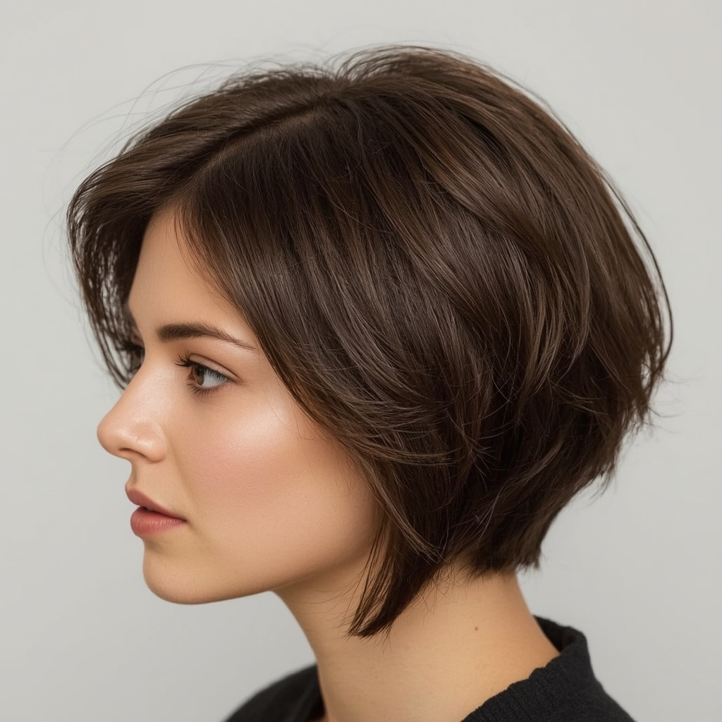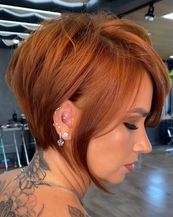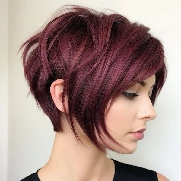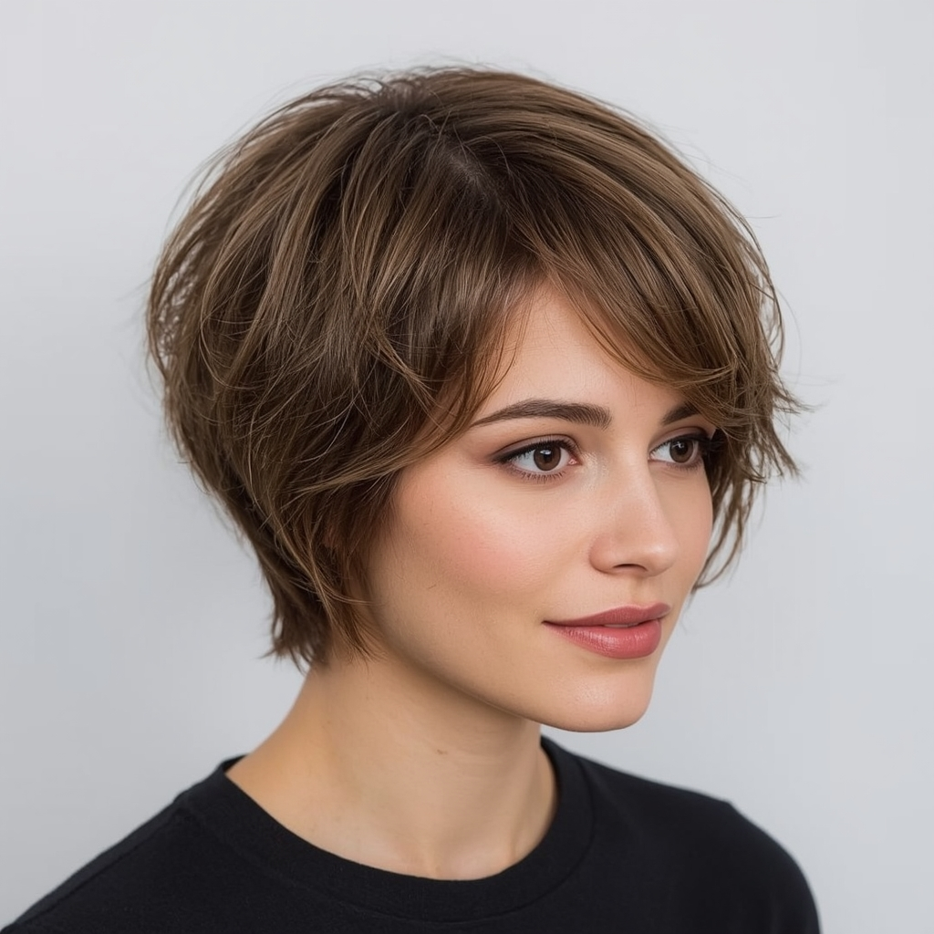 This layered pixie with side-swept bangs combines elegance with dimension. The bangs soften the face while the layers add movement, creating a balanced and flattering silhouette. This hairstyle is versatile, easily styled for both casual and formal occasions, and ideal for women who want a sophisticated yet playful look.