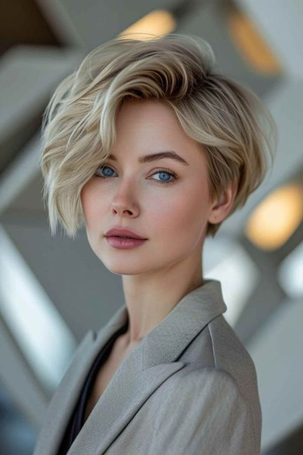 The bold pixie bob with an asymmetrical sweep combines structure with flair. The angled front adds sophistication, while the shorter back keeps the haircut sharp and manageable. This cut exudes confidence and works well for women who want a modern, stylish appearance with minimal styling effort. Regular trims maintain the precise shape and enhance the overall look.