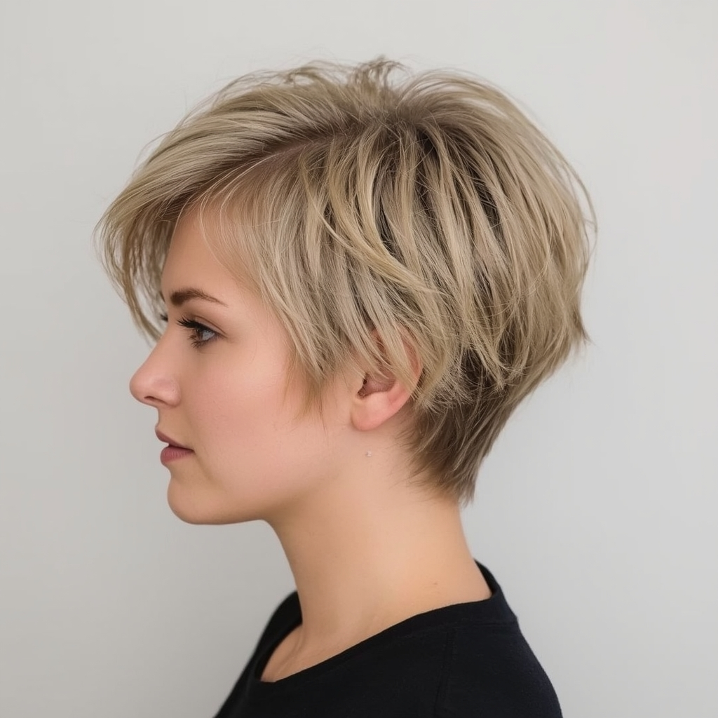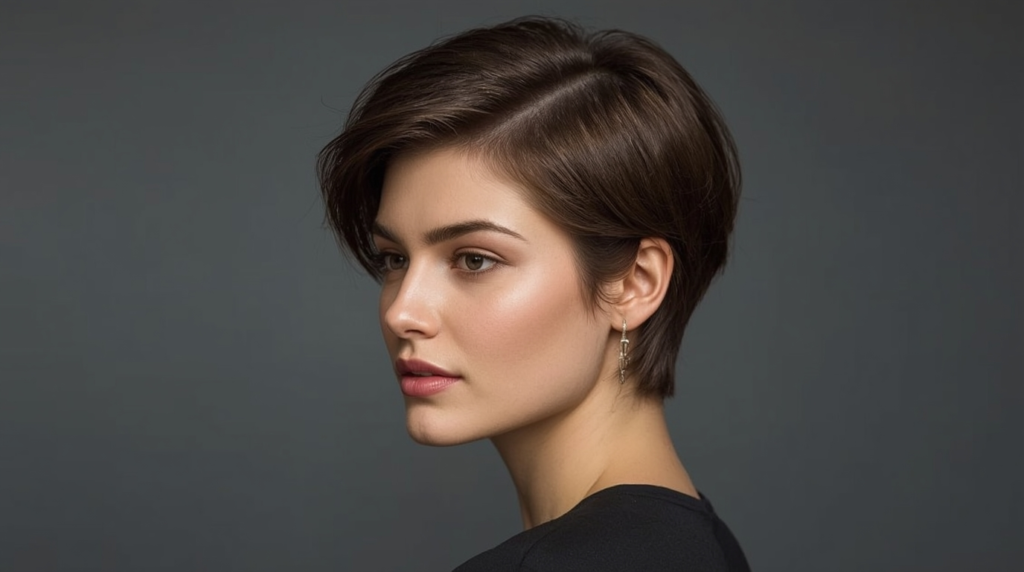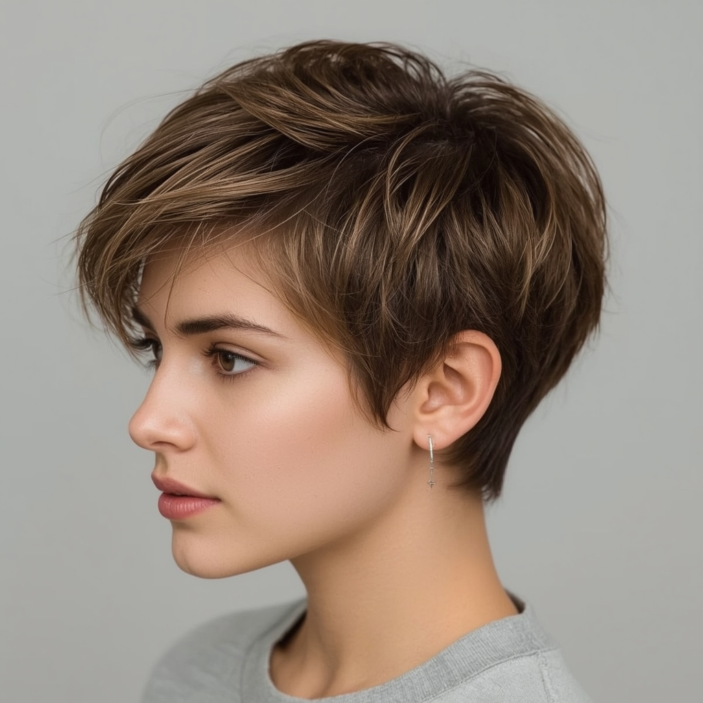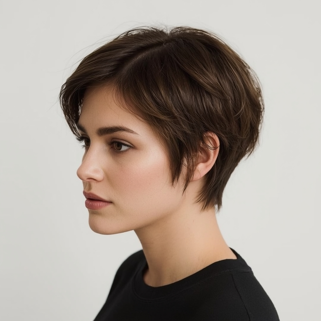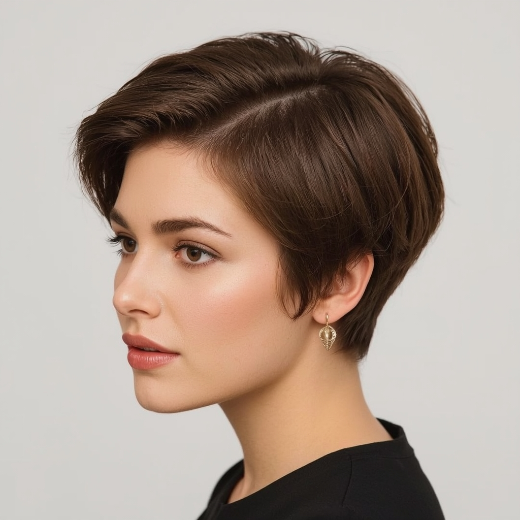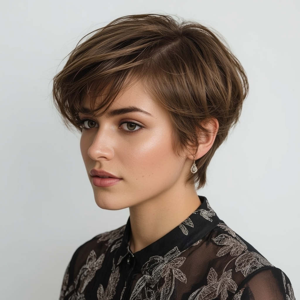 A pixie featuring side-parted bangs offers subtle elegance and enhances your facial features. The side part introduces asymmetry that softens sharp angles while providing visual interest. This cut is perfect for women who want a manageable short hairstyle with a touch of classic sophistication. Pairing it with lightweight styling cream can help keep the layers defined and smooth throughout the day.