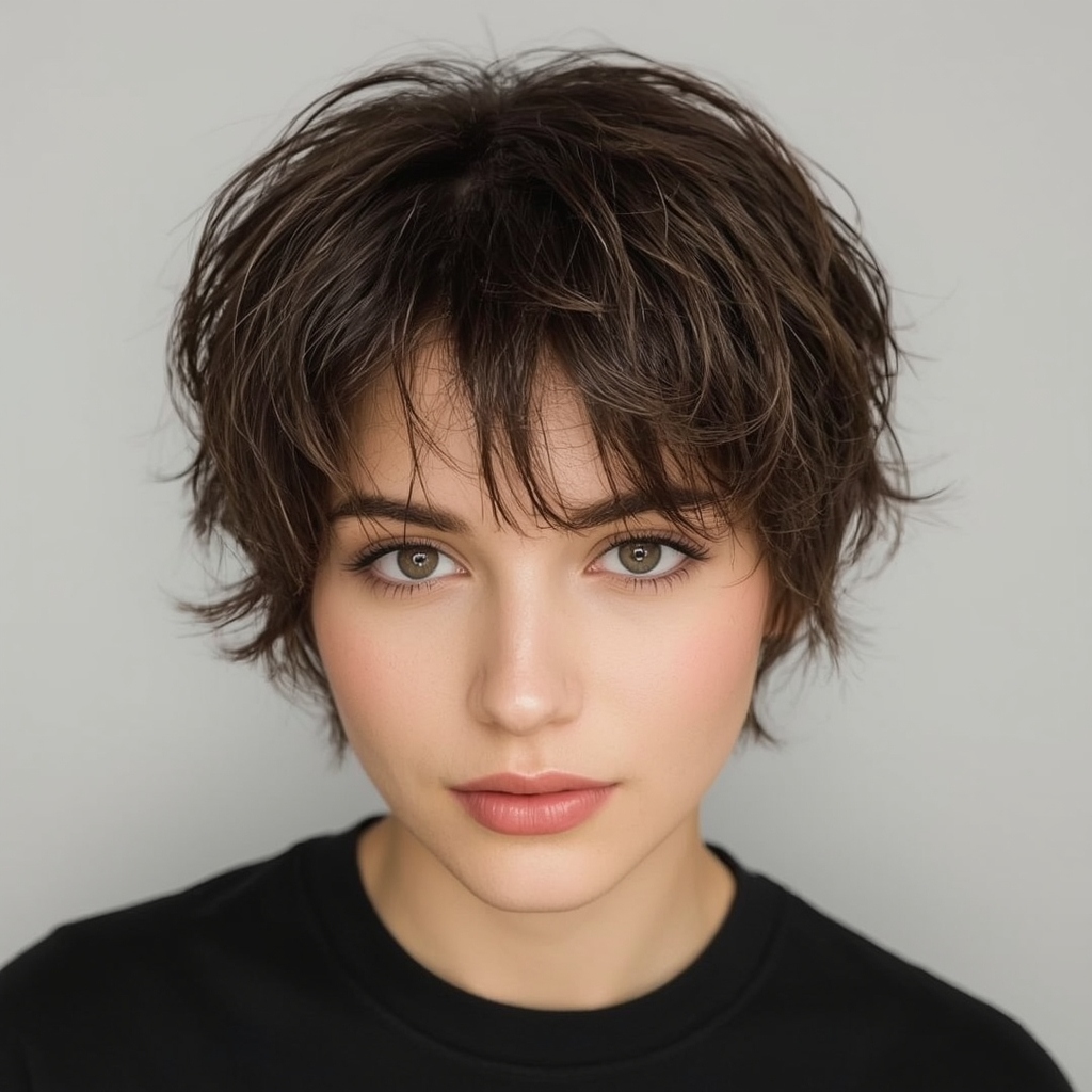 Edgy and modern, a choppy pixie with full bangs adds volume and texture while framing the face beautifully. The textured layers give the haircut an energetic vibe, making it versatile for everyday wear. This style is suitable for all hair types and provides a youthful, refreshed appearance that works year-round.