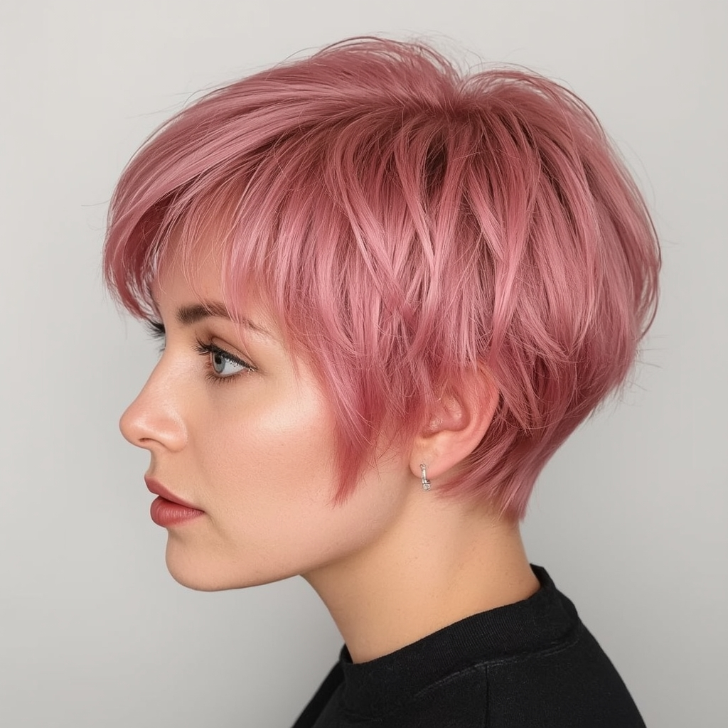 A pink pixie bob adds a fun, vibrant twist to a classic cut. The bold color makes a statement while the short layers and structured shape keep it chic and wearable. This playful hairstyle is perfect for women who want to showcase their personality and stand out with a youthful, confident look.