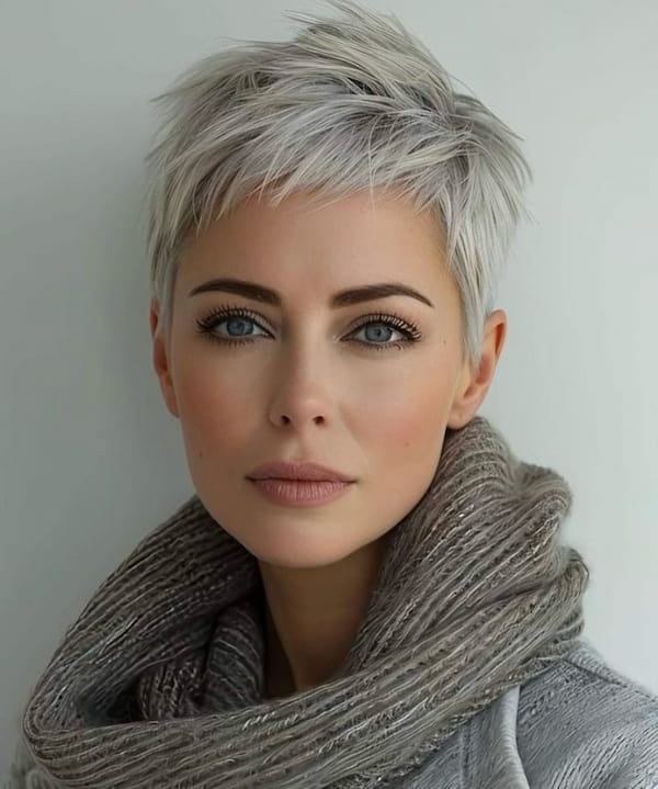 This cut is ideal for low-maintenance styling, allowing several weeks between salon visits. Use a smoothing serum to maintain shine and softness. The gray layered pixie is elegant, modern, and practical.
