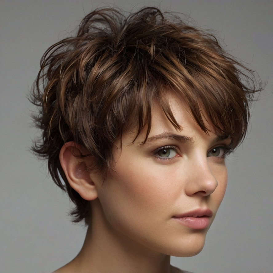 The light brown shaggy pixie blends warmth and texture for a casual, stylish look. Tousled layers create a relaxed, lived-in feel, giving fine hair added volume and personality. This cut is ideal for women who want a natural, effortless style.