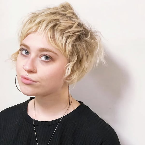 A layered shaggy pixie provides fullness and shape while maintaining a soft, feminine feel. Ideal for thick or wavy hair, the layers reduce bulk and allow natural movement. This style keeps hair light and manageable while giving a modern, stylish silhouette.
